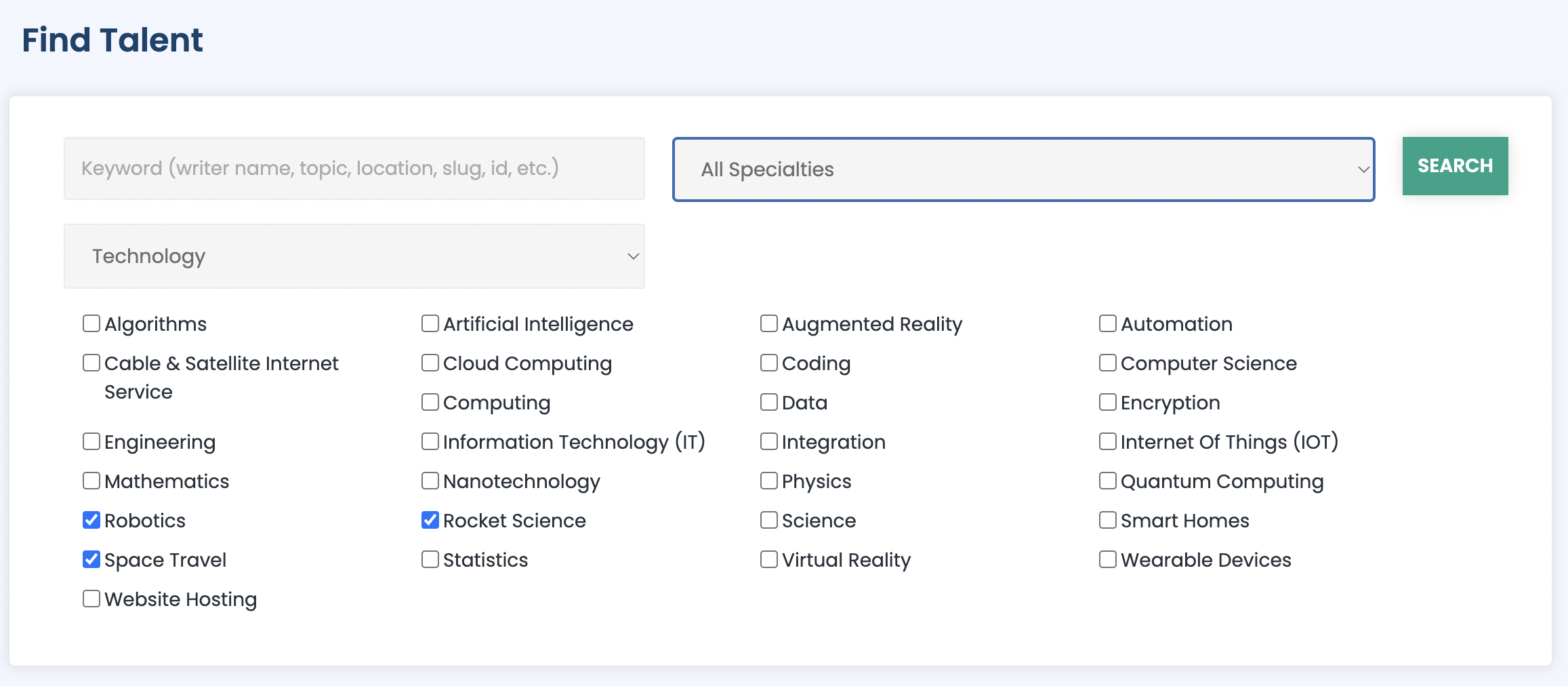 You'll find the same function available if you search for Writers using the 'Find Talend' feature. Find writers that are subject matter experts in your industry by filtering down your industry and topic areas. Click the heart icon to add them to your Favorited Writers list.