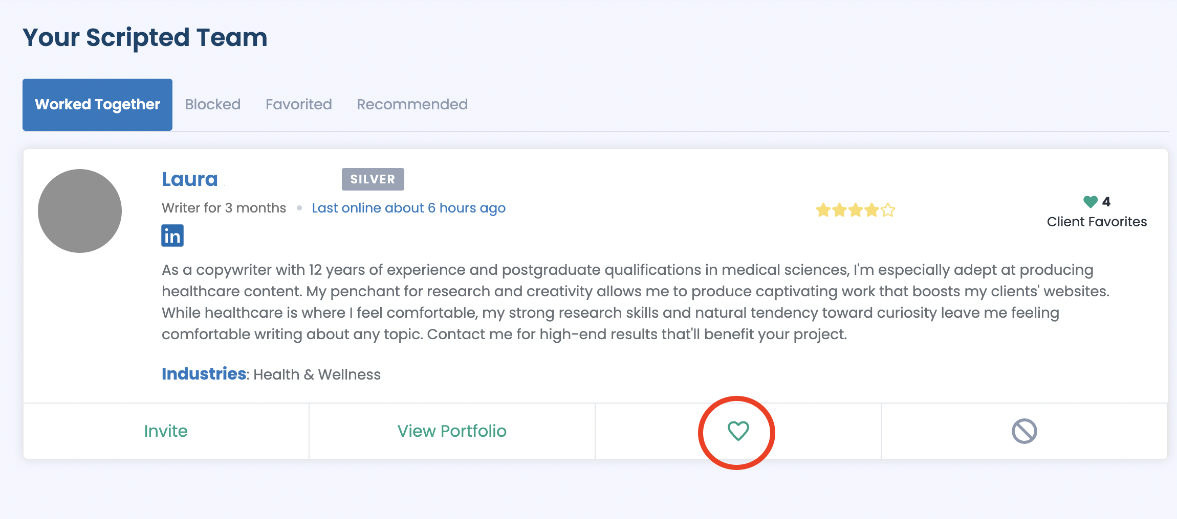 Already worked with some awesome writers on Scripted? The next step is to Favorite them, to ensure they're easily accessible to invite to any new Projects you start.